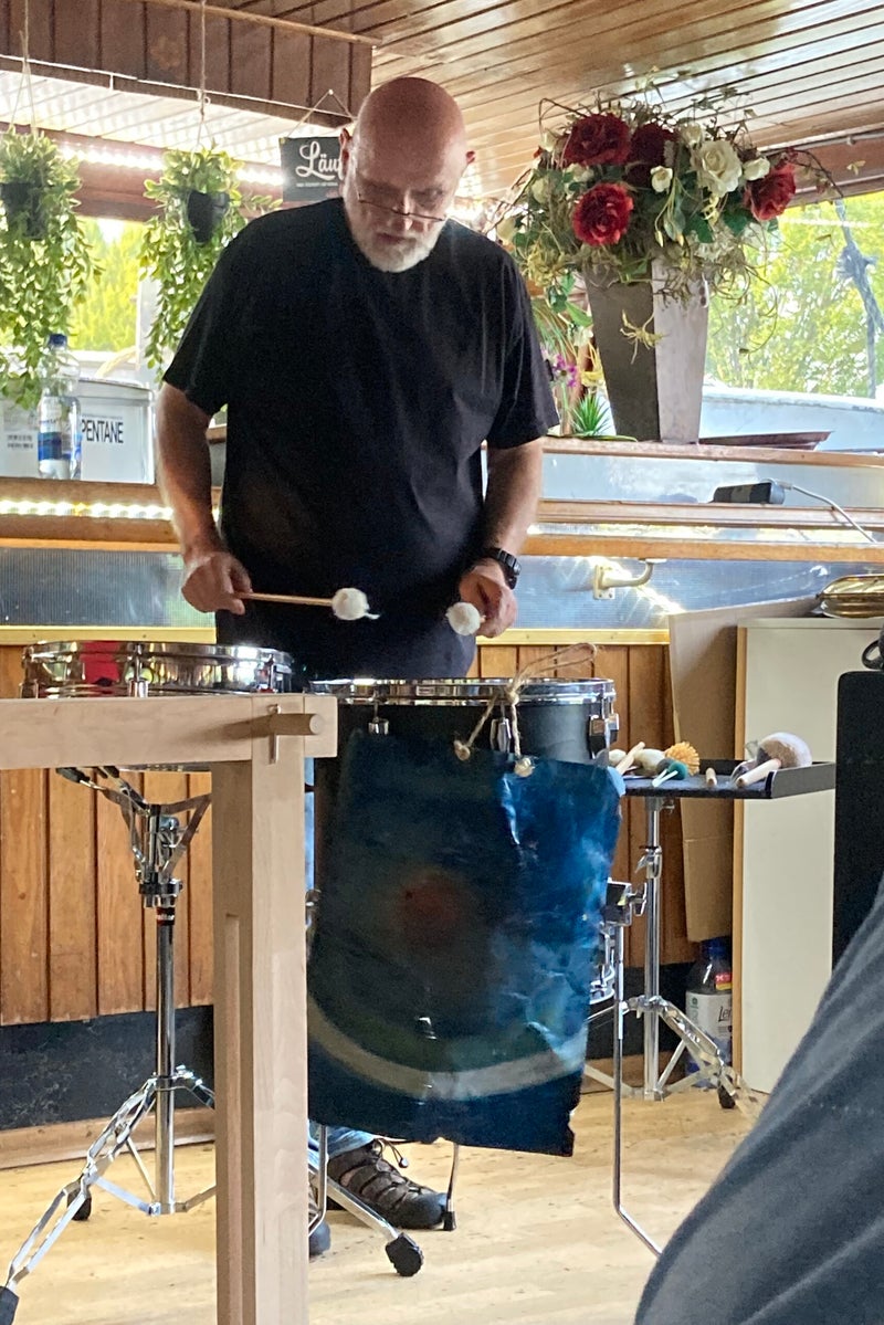Schwere Frage, leichte Frage. Man könnte sagen, alles was klingt, aber das wäre vielleicht übertrieben. Trotzdem passe ich meine Instrumente und meine Spielweise gerne den Begebenheiten, den Stücken, den gemeinsamen Ideen an. Hauptsächlich gilt meine Leidenschaft Z.Zt. der Percussion. Trommeln, Gongs, Becken, Rasseln und allerlei Kleinkram. Aber wenn‘s passt präsentiere ich auch gerne mal meine elektronische Seite. Synthesizer mit allen möglichen und unmöglichen Effekten, „electronic art of noise“. Und nicht zu vergessen, meinen E-Upright-Bass, garniert mit Effekten. Und natürlich, nicht zu vergessen, meine olle Bassfanfare, meine Sirene und, und, und.